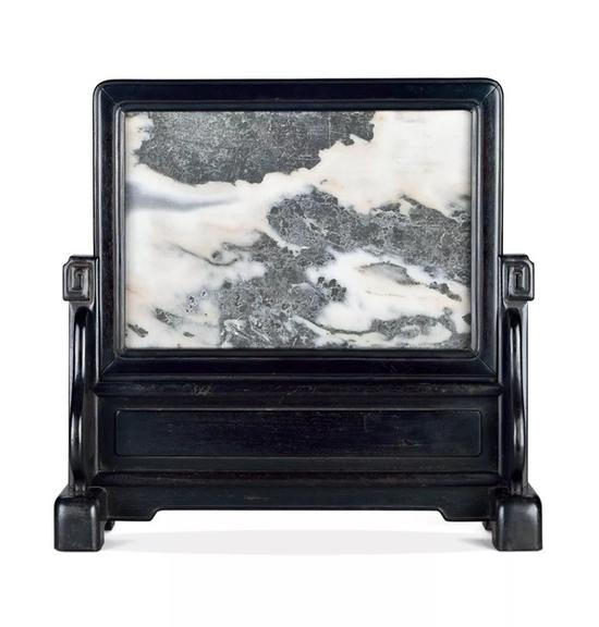 插屏由屏座和屏面两部分组成,可拆分组合。屏座以紫檀制成,其中位于两侧的站牙下承拱足,形体健壮丰厚,用料大气;屏面以紫檀为材四边攒框,边框内缘起阳线,框内镶嵌云石屏心。屏心云石纹理如青山出岫,烟云缭绕,意境幽远。此件插屏以紫檀制成,鲜有装饰纹饰,其结构稳健,造型简约庄重,沉稳大气,与屏心风云变化之云石形成鲜明对比,为材质、清赏俱佳的陈设品。