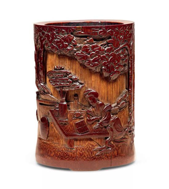 明末清初 竹雕易安居士庭院填词图笔筒