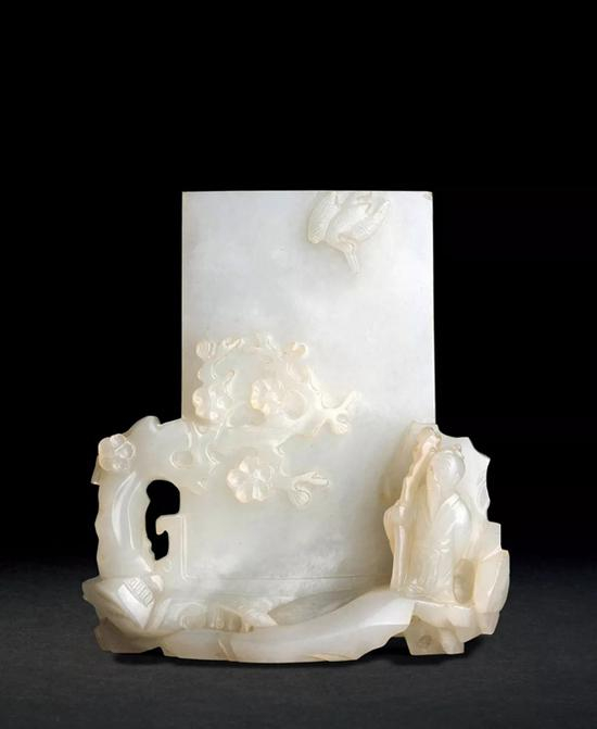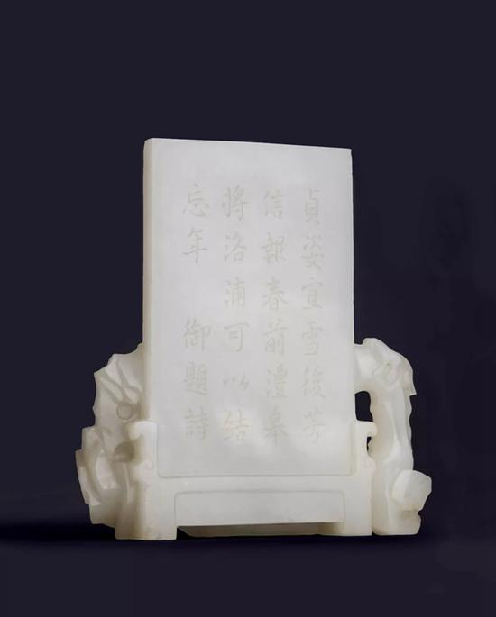 背面题刻御制诗:“贞姿宜雪后,芳信报春前。澧皋将洛浦,可以结忘年。”收录于《清高宗御制诗文全集》,乾隆二十三年。可比较与此件玉雕相近主题,但布局略异、同带御制诗的白玉屏,现藏台北故宫博物院,刊录《宫廷之雅:清代仿古及画意玉器特展图录》,国立故宫博物院,1997年,编号62及67。