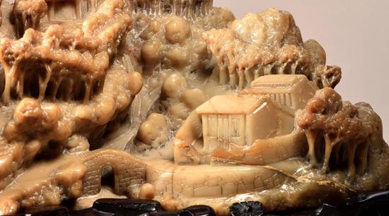 所谓“山子”,是文人墨客置于室内、用于观赏的精美摆件,多是用整块玉石雕琢而成,在保留其原始玉料整体外形的前提下,依石之自然施以巧工:或成崇山峻岭间以小桥流水、山林树木;或有亭台楼阁、花鸟人物,进而形成一种高低错落、布局得当的艺术效果。因其成形后极似一座微缩的山水景观,故名。山子体现的是中国传统工艺独特审美标准的一种极致,为世人青睐。