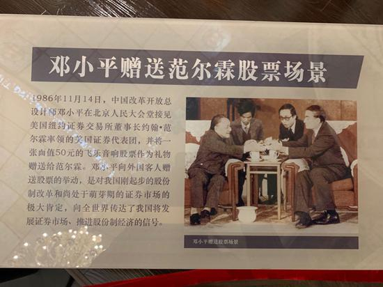 中国证券博物馆中还原了大量中国证券市场的历史场景。除了上交所首个开市铜锣外,还有1986年11月14日,中国改革开放总设计师邓小平赠送美国纽约证券交易所原董事长约翰·范尔霖股票的场景还原等;第一次严格意义上的股票发行——飞乐音响的股票样本、相关文件等历史物件。