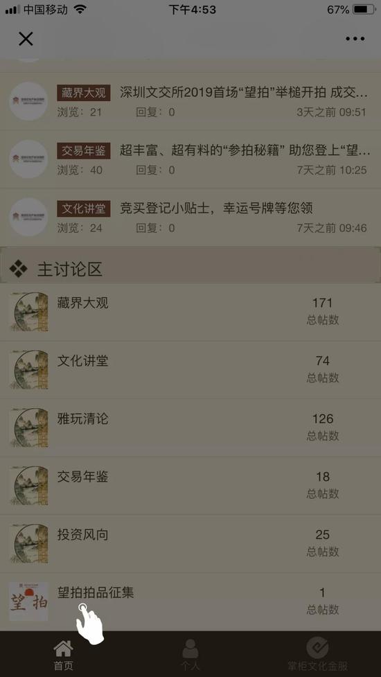 ③选择“主讨论区-望拍拍品征集”版块,点击发帖