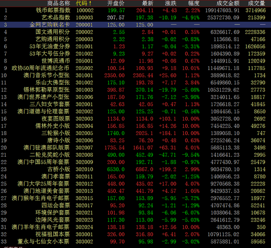 成交额上,中山陵成交1289.59万,成交量为42584;政协50周年流通纪念币成交1146.97万,成交117785;十六运会吉祥物片成交1125.25万,成交11702;祝福祝国本票成交1079.11万,成交量为34066。