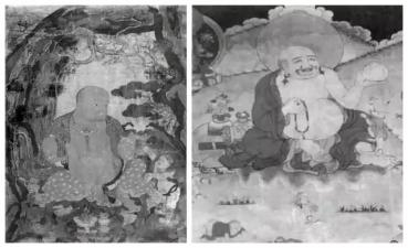 左图为15世纪哈香尊者,大英博物馆藏品 右图为贡噶曲德寺主殿壁画—哈香尊者