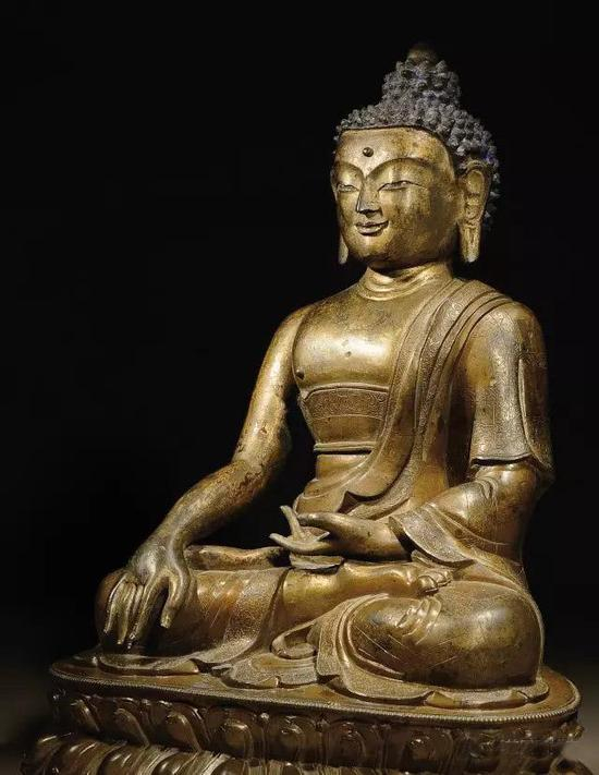 此尊释迦牟尼像为标准的乾隆宫廷造像。乾隆宫廷制作的金铜佛像以小型像为主,采用失蜡法,由中正殿画佛喇嘛及章嘉等大喇嘛画纸样,再拨蜡样,后交造办处铸造,重要的造像每道工序都要“恭呈御览”,反复修改。当时的宫廷造像匠师不仅有汉族人,还有蒙古、西藏及尼泊尔人,多种艺术因素交融,创作出乾隆宫廷风格造像。在延续永宣宫廷造像艺术精髓的基础上,发展出更加华丽而具宏阔气度的造像风格。创造了继永宣之后内地造像的又一高峰。