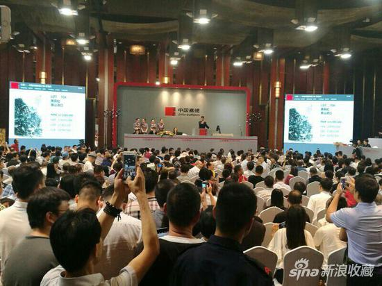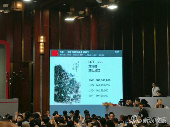 6月19日晚,黄宾虹巨制《黄山汤口》以7200万元在嘉德2017春拍“大观——中国书画珍品之夜·近现代”起拍,价格很快突破亿元大关,随后更是以1000万元的竞价阶梯上升,在场内多位买家之间展开竞争,现场竞买异常激烈,最终以3亿元落槌,花落场内中区9027号买家,加佣金以3.45亿元成交,拍前估价为8000万-1.2亿,为本场估价最高拍品。