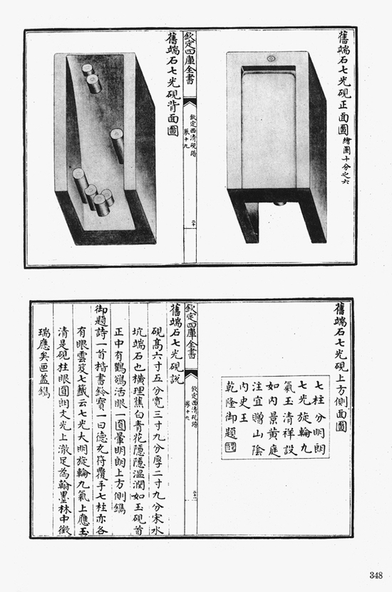 砚传千载,历代宝之者众,撰文著述,辑之成谱者亦多。宋代如欧阳修之《砚谱》,米芾之《砚史》,唐询之《砚录》,叶樾之《端溪砚谱》,明代曹昭《格古要论》中之《论古砚》,高濂《遵生八笺》中之《论砚》,乃至清代高凤翰之《砚史》,纪晓岚之《阅微草堂砚谱》,吴兰修之《端溪砚史》,沈石友之《沈氏砚林》,皆为著名砚学专述。然若论耗力之巨,规格之高,图绘之精,说明之细,乾隆钦命编撰之《钦定西清砚谱》,当为群谱之冠。