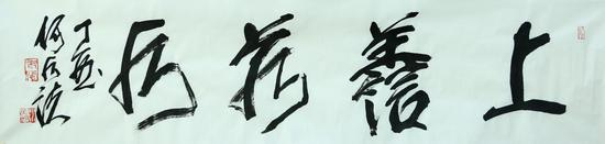 何水法是中国当代大写意花鸟画的领军人物,全国政协委员,文化部中国艺术研究院研究生院教授、博导,此幅《上善若水》与慈善拍卖的主题完美契合。何老以笔下的百花为众人知,其作品有独特的“何氏”风格,磅礴的气势,盎然的生机,有声有色地引领着当代大写意花鸟画的时代风向标,书画同源,这幅书法作品亦用笔畅快淋漓,锋芒毕露,富有傲骨之气,如同断金割玉一般,别有一番韵味。何老用笔下的百花来表达世界的祈愿,更用书法的“善”传达美好的祝愿。