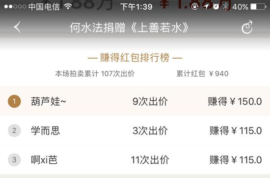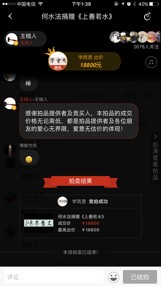 7月8日中午12点40分,由著名花鸟画家何水法捐赠的书法作品《上善若水》在库拍在线慈善拍以0元起拍,短短两分钟就以1.88万元的价格成交,由库拍藏家@学而思 竞得,2500人参与了本场拍卖,出价用户累计获得红包940元。
