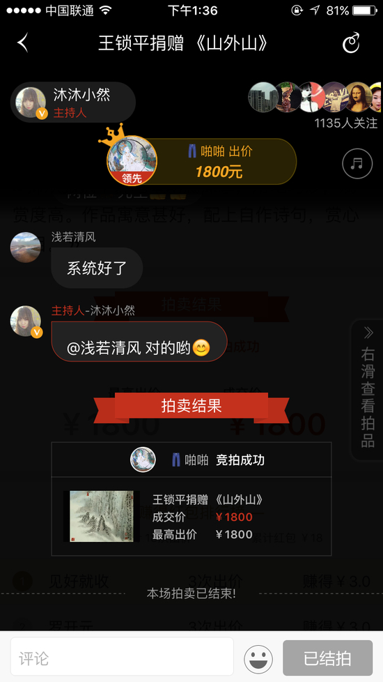 7月21日中午12点40分,山水画家王锁平的捐赠作品《山外山》在库拍在线慈善拍以0元起拍,最后以1800元的价格落槌,由爱心网友@👖啪啪竞得。感谢艺术家王锁平奉献爱心,也感谢参加慈善拍的各位用户,让我们一起为爱助力。