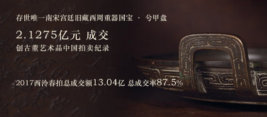 2017西泠春拍以总成交额13.04亿,总成交率87.5%荣耀收官!国之重器兮甲盘在近三千年后轮回,震古铄今,景助春拍各大专场喜获超高人气、超高成交率、超高溢价率,再创五个白手套专场,并创多项拍卖纪录。到本届春拍,西泠拍卖已推出 17 个具有“中国首创”意义的新专场,本届西泠春拍必将成为中国拍卖史上浓墨重彩的一页!