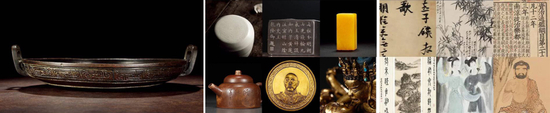 本届西泠春拍,清中期·龚心钊旧藏杨彭年制、陈曼生刻香蘅款紫泥粉彩泥百衲壶,以1449万元成交,第三次在西泠拍卖创曼生壶最高成交纪录,同时也创造曼生壶世界拍卖纪录;民国·张作霖中华民国十六年伍拾圆龙凤金币,以908.5万元成交,创金币中国拍卖纪录;北宋·定窑“尚药局”款暗刻龙纹圆盖盒632.5万成交;清乾隆·御铭宋代端石七光砚885.5万成交;十六世纪·铜鎏金嵌绿松石胜乐金刚像816.5万成交;清·皇六子奕欣自用田黄石素方章690万成交。
