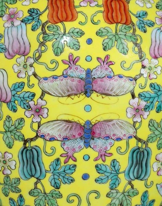 罐通体以柠檬黄釉为地,色泽靓丽晶莹,娇艳欲滴。颈部绘如意云头纹一周,底足处装饰变形莲瓣纹,除此之外器身外壁及盖面均以洋彩绘饰瓜瓞绵绵纹样,瓜藤繁茂,蝴蝶翩跹,色彩、姿态各异,构图繁缛华丽,画工复杂而不失严谨之态,雍荣华贵,气度不凡,带有浓重的乾隆遗风。罐身内壁及器底则施松石绿釉,并于底心矾红彩书‘大清嘉庆年制’六字三行篆书款。