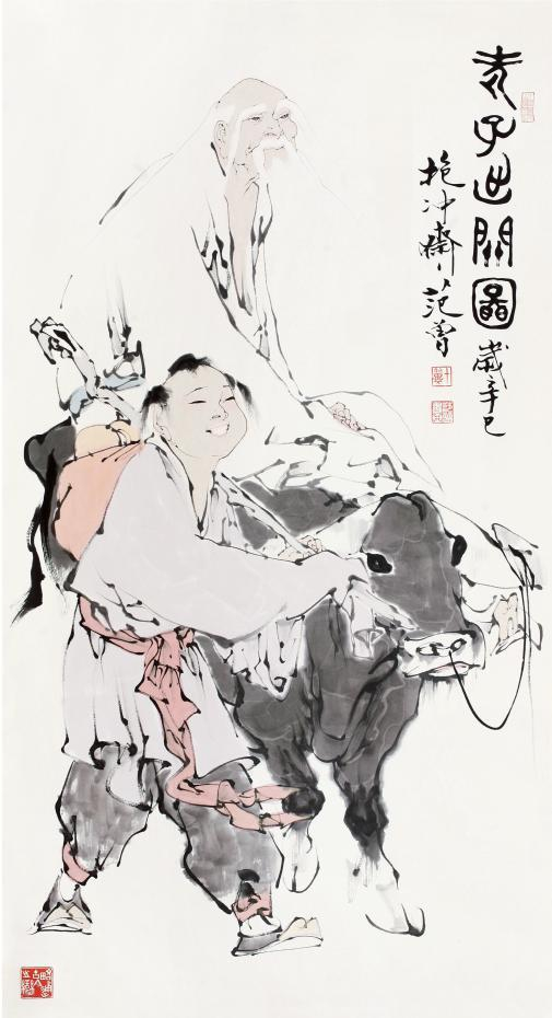 泽畔行吟的屈原,深思出关的老子,把酒临江的曹操,仰观天象的一行,面壁邃悟的达摩;还有补天女娲、玩潮神童、缁衣钟馗、说梦庄周……无不在范曾笔下化作生动形象,呈现出来。《老子出关》是范曾最具代表性的创作题材之一,他曾谓:“平生爱写老子出关,意永神隽,笔趣古朴,世人宝之有由然也”。画中老者双目微唅,凝视远方,侧坐于牛背上,童子牵牛,神采奕然,真似神仙东来,一派祥和。画作线条明快,人物造型生动;一股古朴隽朗、舒然淡雅之气跃然纸上。人物神态变化精微,可谓是变化无穷,百看不厌。因为先生对待每一幅作品都以出古推新的心态而为,以捕捉新鲜的感受,获得更高层次的新领悟为追求。正是秉承这种内心的激情与沉静以及殊堪自信的非凡笔墨,范曾造就了这独特的绘画符号,开创了范式的“老子出关”。