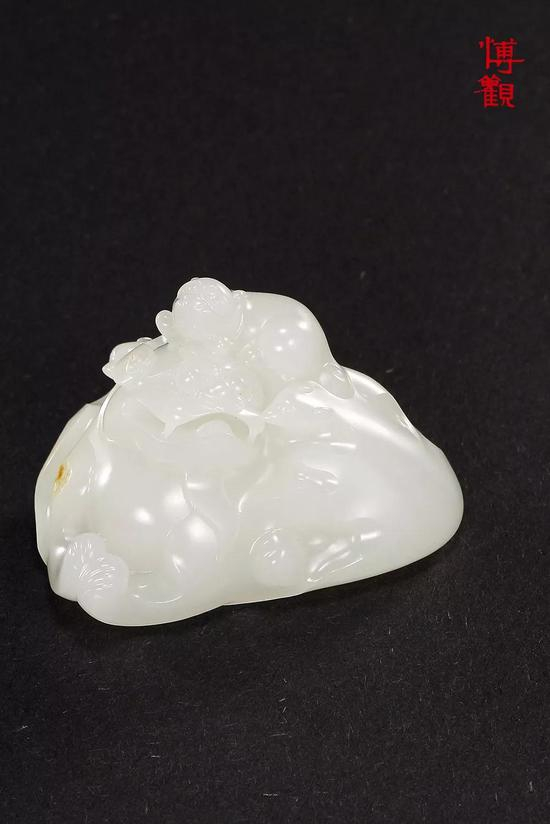 龙龟相传为神龙所生之子,与“荣归”同音,寓意衣锦还乡荣归故里。此把件质温润洁白,造型饱满,毛发脉络清晰,精雕细琢,足见工艺之精细。整件作品古意盎然,怀旧气息十足,为“上海杰艺”在十几年前所作,是一件有历史意义的代表作。