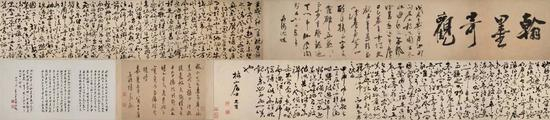 他对此卷祝允明草书《前赤壁赋》赞赏有加:“右枝山居士祝允明草书东坡《前赤壁赋》,乃其晚年所书真迹也。……此亦醉中兴酣运笔迅书,大有寄妙理于豪放之外,出新意于法度之中,真可谓一时之书,一时之妙也。”不愧是祝允明艺术最为成熟时期的狂草代表之作。