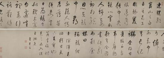 董其昌书法用笔最突出的特点为“虚灵”。在此方面,他有独到的论述:“书法虽贵藏锋,然不得以模糊为藏锋”,“盖以劲利取势,以虚和取韵。颜鲁公所谓如印印泥,如锥画沙是也”。“虚”包含了丰富的内涵和无穷的意韵,如此幅《连环歌》,用笔以劲力取势、以虚和取韵,使其作品风神超逸。此卷董其昌运笔轻松,任性率真,神满韵溢,逸致翩翩之态。古雅意趣跃然纸上,叹为观止。