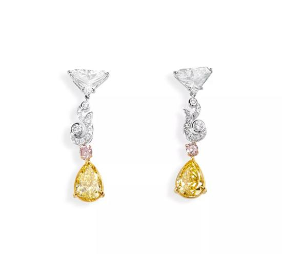 1.25及1.12克拉梨形艳彩黄色钻石配粉钻、钻石耳环一对