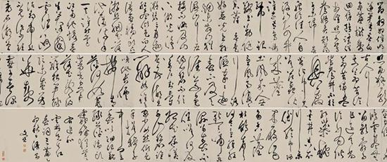 此卷草书闲散而不失章法。错落有致,神采风骨,兼怀素和祝允明之长,甚见功力。书法、词体俱美,可谓珠联璧合。