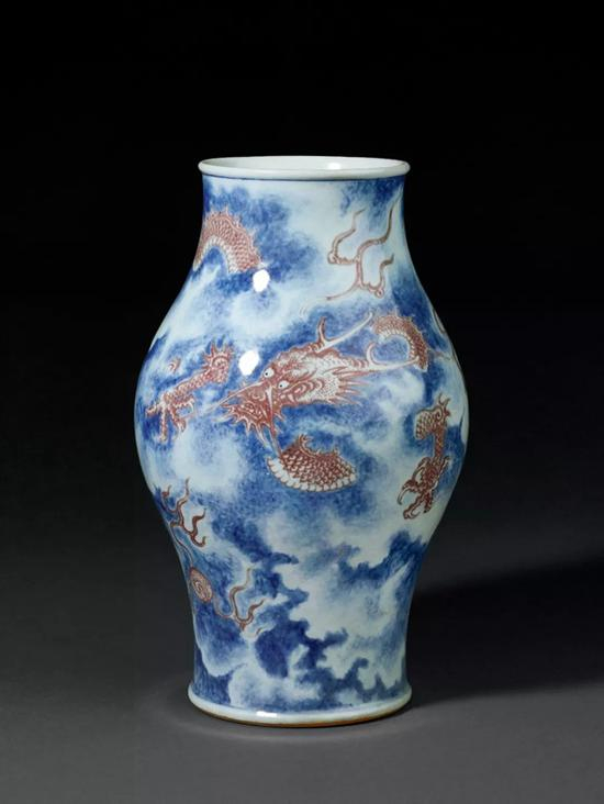 青花釉里红被视为成功率最低的瓷器品种,拍品青花和釉里红均呈色稳定,颇为难得,红色淡雅,具有乾隆时期的典型特征。橄榄瓶器形与台北故宫博物院藏清乾隆青花加彩九龙瓶相似。
