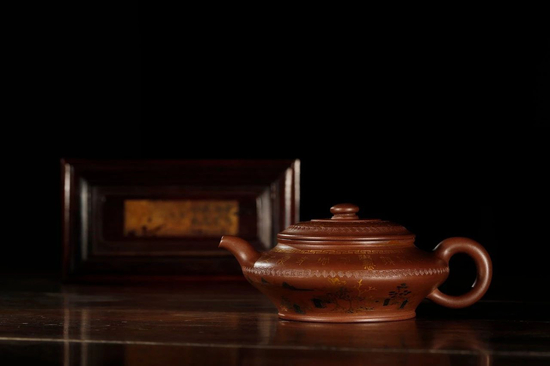 清代宫廷紫砂传器,属三代时期最精,至乾隆时期达到最高峰。“乾隆帝一生嗜茶,对茗饮用具的考究登峰造极,不仅要求紫砂茶具保留最佳的品饮功效,而且要与官窑瓷器一样,集诗、书、画、印为一体。(《故宫博物院藏宜兴紫砂》)”除此之外,乾隆时期宫廷紫砂展现出与康、雍两代最大的差异性在于其富丽堂皇的装饰风格,戗金、描金、描银等华贵的手法在此时得到了应用,可谓别开生面。一持“乾隆年制”四字款描金描银御题诗方壶,堪称珍宝,保存于北京故宫博物院。此壶被认为是乾隆御用描金银紫砂器的标准件。从目前所见传器(包括残器),初步认为,描金描银并落年号款的传器,仅见于乾隆一朝,后世或因国力衰退而不复制作。因此,时至今日,此类宫廷珍品,更是奇货可居,一般藏家不轻易示人。