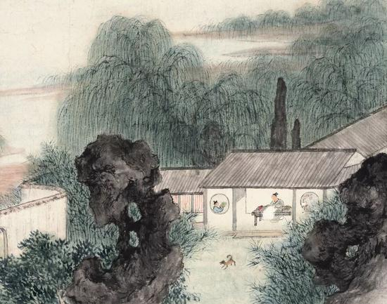 从此帧《数青草堂》,我们得见吴湖帆化虚为实的烟云处理,这种表现手法上的变化,是受到海派的启发。识者尝评吴湖帆画“合古今中西之法,有烟岩万迭之势”。细观画中线条刚柔相济,设色清润雅致,确是先生山水小品的精构之作。