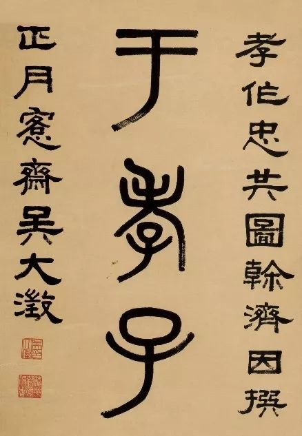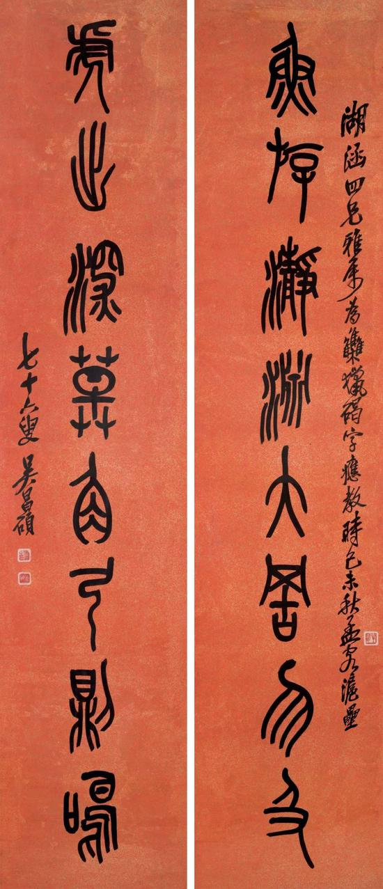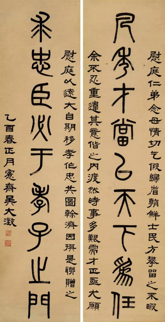 本联写于光绪十一年(1885)正月。据吴大澂《愙斋自订年谱》及顾延龙《吴愙斋先生年谱》,光绪十一年正月间,吴大澂行踪、事迹不少皆与朝鲜事宜有关,包括与日本谈判中日两国同时从朝鲜撤军事宜等,吴大澂即为中方谈判代表之一,可谓正值其官场备受重用,意气风发之时。故是联写来字字神完气足,方正中蕴圆润,平正中见奇逸,古雅庄重,高古浑穆,呈现出一种前人未曾有过的奇古整饬的篆书风貌,正是最成熟、最典型、最具独创性的吴大澂篆书。加之是联尺幅巨大,字大如斗,实可谓气势恢宏,皇皇巨制也。