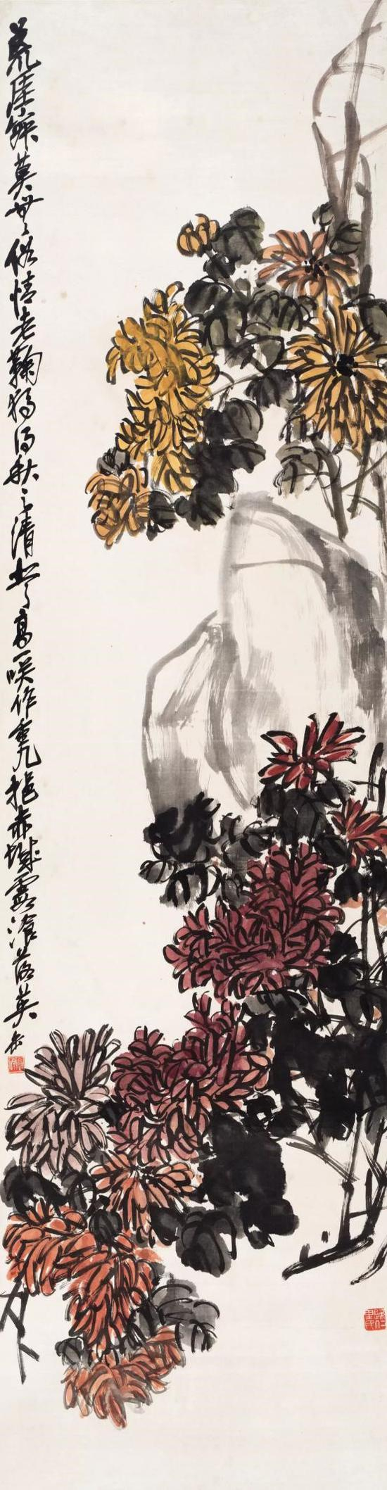 缶翁之画,色即墨,墨即色,曾自云“墨痕深处是深红”。此幅作品笔墨劲爽老辣,设色古朴沉着,朱磦、赭石、曙红与墨痕复叠错综,浓厚而不滞重,多彩而不媚俗。是幅《秋菊图》曾为日本藏家阿部文吉旧藏,于1937年被收录入《东京美术俱乐部展览册》出版并展览,实为难得一见之佳构。