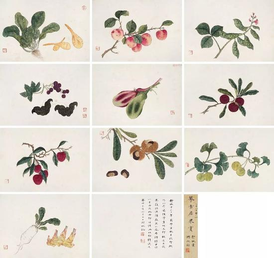 潘静淑(1892-1939),名树春,吴门大画家吴湖帆夫人。潘静淑擅绘花卉蔬果,辅以个人气质修养,设色清丽淡雅,笔下流露秀逸之气,具出尘之致。潘静淑画风细腻优雅,正是她大家风范的写照。潘氏早逝,故流传作品不多,市面册页作品多为散出,整册作品实属难得。