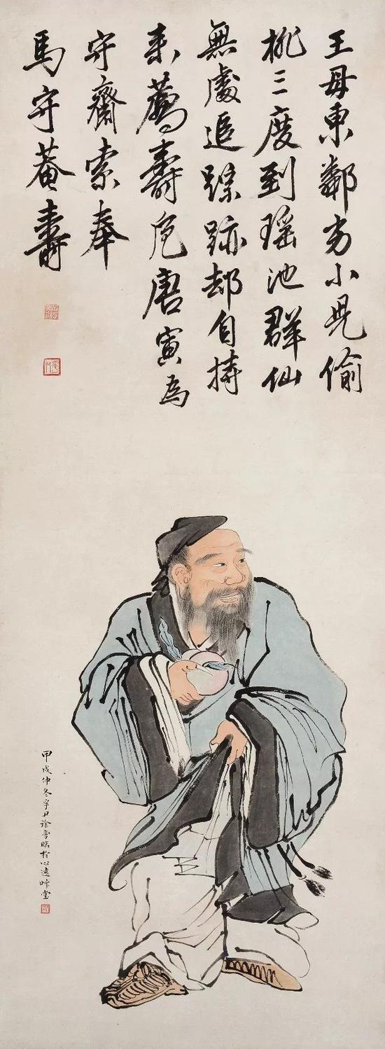 明唐寅曾取材东方朔偷桃的故事绘制《东方朔像》,是画家盛年佳作。民国时期,此作更成为海上较为流行的人物画临摹范本。据吴湖帆弟子许兰台回忆,此唐寅原作当时为梅景书屋门人王季迁所藏,曾请吴先生鉴赏,吴先生甚为欢喜,故按原画摹写,亦有临本存世。