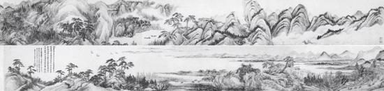 画面布局由密及疏、由近及远、由险入平。观之如在江岸之边,视线跟随着泉石烟云在回环曲折中向前推进,忽又豁然开朗,眼前江景一览无余,画面静能生动,生机隐现,令人心旷神怡。