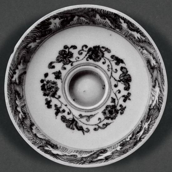明初青花瓷器中,有一类无论器形或纹饰,均明显受西亚地区金银器或陶器的影响,与传统风格截然不同。拍品所绘海浪纹为宣德宣德时期常见,属于传统纹样;但外壁饰缠枝花卉纹则与传统画法有别,尤其缠绕的卷叶弯曲而细长,形似新月,而同时期仿西亚风格的瓷器如双活环耳扁平大壶、花浇、绶带耳扁瓶等亦绘有相近纹饰,因此拍品应亦为受西亚造型、纹饰影响的同类器。