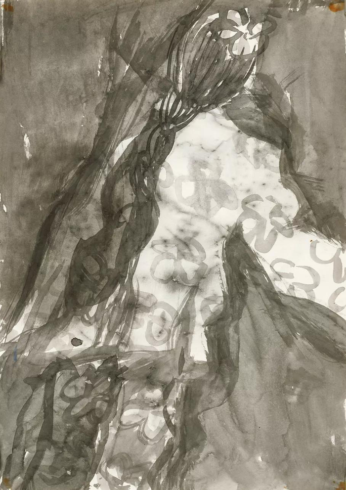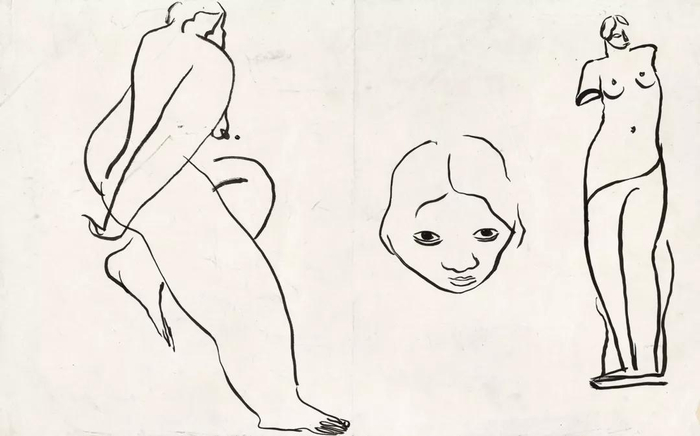 《梦中情人》记录了三位女性,左为一倚靠状侧身裸女,应是大茅屋模特,宇宙般大腿、梳齿状脚趾是常玉典型风格;中间绘一昏昏欲睡女子头像;右者乃巴黎卢浮宫镇宫之宝“米洛的维纳斯”,寥寥数笔将神话中“爱与美之神”重现纸上,“单眼”又极具画家个人独特语汇。目前所知常玉以卢浮珍宝为主题的作品仅此一件。