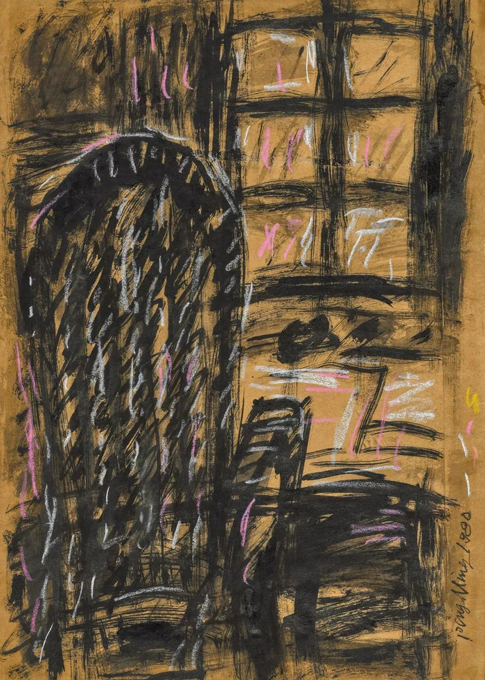 本幅《藤椅和窗》将线条的“书写”发挥到极致。熊秉明用快速、繁密的线条,赋予藤椅和窗前卫造型,通过短小的粉、白线条交代明暗,饱含自由和激情,与赛·托姆布雷(Cy Twombly)标志性凌乱线条有异曲同工之妙。