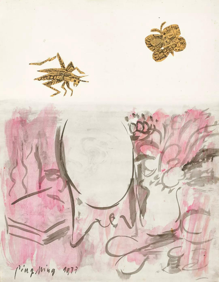 本幅《蝴蝶蝗虫镜子》用粉色敷染背景,以黑色墨线勾勒梳妆台上的物件,镜子、花瓶、剪刀、线圈不一而足。柔和的粉色洋溢青春气息,犹如《虢国夫人游春图》“无春之实,有春之意”。上部是报纸剪贴而成的蝴蝶和蝗虫,熊氏借用报纸本身文字图案,略加点划,使两只飞虫活灵活现,显然是受到当时西方盛行的拼贴艺术影响。