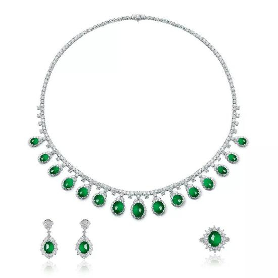天然满绿翡翠配钻石项链、戒指及耳环一套