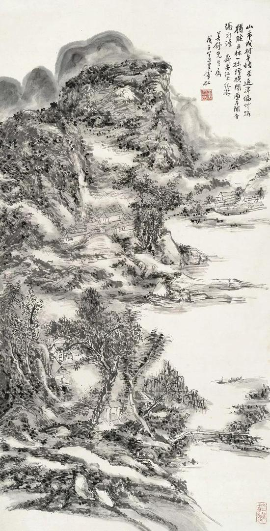 采用其常用“左山右水”式构图却不落寻常蹊径