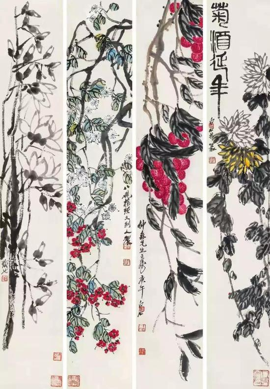 此《花卉四屏》创作于其“衰年变法”后第二年