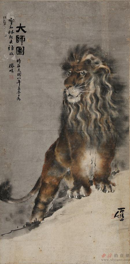 创作于民国八年立春的《大师图》,题“为宝初叔祖大雅正”。落款凤鸣是林风眠早年的字,此时还没到过巴黎,没吃过面包。西阳山人的号显然跟梅州西阳阁公岭有关。画上钤方形朱文印“肖愚”、异形白文印“西阳山人”。李金发创办的《美育》杂志,保留下一份珍贵的林风眠早年印谱。根据杂志期号和图片说明推算,这批印章是林风眠在梅州中学时期留下的。其中即包含《大师图》上的“西阳山人”和“肖愚”两个印章。印谱自叙“弟毕业将别,无以为赠,自思有自刊名印几方,然粗劣实属不堪。转念同学爱友厌拙竟何妨。足下留此纪念而细思余为人可也”,也就是说印谱上的印除了三方特别注明的,其余都是青年林凤鸣亲手刊刻。谱中载“肖愚”印文的有四枚,其中一枚根据林氏自注为“家严手刊”,家严指父亲,即林父林伯恩。林父送给儿子“林凤鸣”、“林氏”、“肖愚”三枚印应该都和姓名有关,可以推断“肖愚”应该是父亲给林凤鸣所定的谦称或小名,意义特殊,所以他多次复刻。根据年谱,林风眠此时从梅州中学毕业,得到留法俭学的消息就立志“为中国艺术运动下功夫”,后和林文铮、李金发等人到上海登上游轮,前往法国留学。看这批林氏自用印,“剑生、画痴、笔墨兮一生缘”这些都是座右铭,是他艺术生命的图腾,“肖愚”、“西阳山人”又深嵌乡情和父爱。《大师图》也是具有宣言性质的。林风眠此时期书法墨迹极少,《大师图》提供了珍贵的实物。虽然与印谱字体不同,但笔致相近。画是给长辈的所以行文落款有礼有节,雄浑刚劲似翁同龢书风,颇有远志。印谱是送同学的,所以选择了比较有个性的似郑板桥体。狮子的题材和画法,显然来源于林风眠当时颇为崇敬的岭南画家高奇峰,高氏创办的《真相画报》杂志封面就常见他画的大狮大虎,这个后文再说。此画作于“五四”之年,蔡元培先生成立了中华美育会。