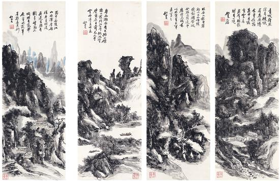 其中,《云山高隐图》作于1928年,属于黄宾虹早中期的作品。中期《苍山对坐图》、《秋山图》、《雁宕一角图》、《阳朔胜景图》皆为典型的“白宾虹”风貌。《蜀游峨眉山水十二图》、《山水四帧》、《水木清华图》皆为晚期化境之作。