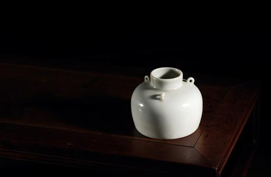 明永乐·甜白釉三系小罐器型特殊,目前所见者均为双系,除甜白釉外,亦有青花装饰者。检诸著录,仅有国家博物馆藏甜白釉暗花三系罐与此件三系小罐相似。除此以外,另有白釉三系鼓式盖罐,可资比对。以及大英博物馆藏甜白釉四系罐,虽器型不尽相同但釉色仍可为参照。另与之相近者即为永乐翠青釉三系罐,两者造型基本一致,可资参考。