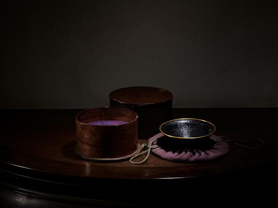 宋·建窑斗笠形油滴天目盏盏口沿微撇、斜弧壁、小圈足,略作斗笠形。盏内外均施黑釉,外壁施釉至近底部圈足,可见垂釉。胎体选料粗砺,器壁厚实,口沿包金边。盏内外可见大大小小呈圆形的斑点油滴状,又似天幕中繁星点点。该盏烧成釉色呈浓重黑灰色。釉汁浓厚,有明显垂坠感。黑釉色泽深沉悠远,油滴斑点遍佈器物全身,自下而上逐渐变得稀疏,均呈现金属质感。釉黑如漆,稠如凝脂,光亮如镜。釉面散步油滴状斑点,状如飞瀑击滔,远观之犹如虹入溪涧,近观之犹如深邃之宙宇,凝视之令人心潮起伏。