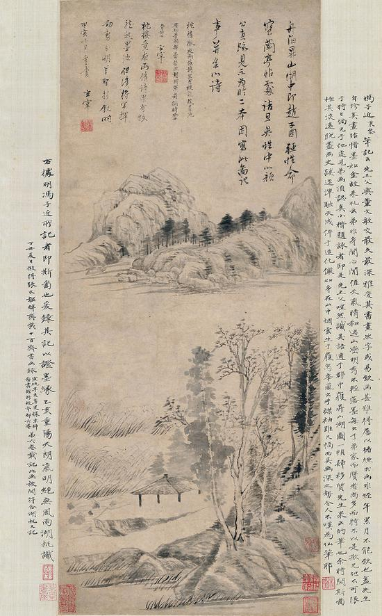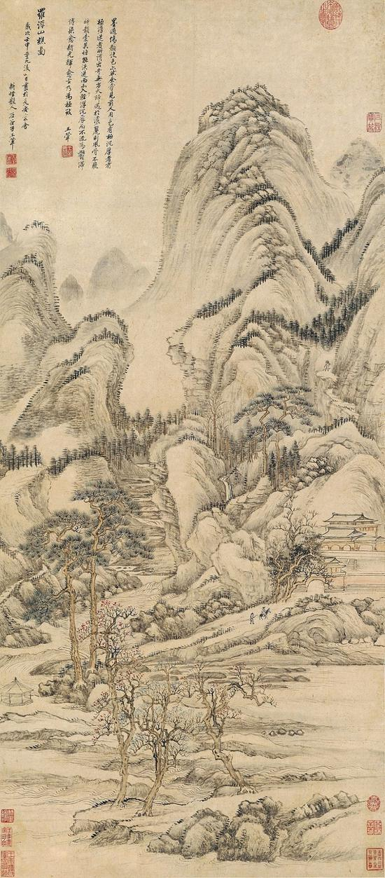 《罗浮山樵图》是一件清宫旧藏之物,乾隆帝曾将此作赏赐给名臣、大学士英和,图中钤有“赐本”印,后入藏鉴藏大家王季迁之手。此作作于六十岁,可看成王翚画风从清丽工秀向苍茫浑厚转变的标准件及绘画生涯里程碑之作。