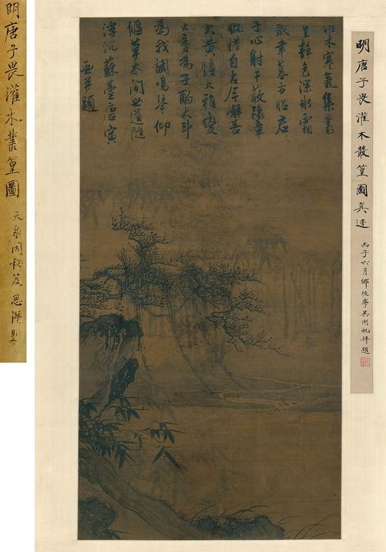 明代吴门书画家作品中值得关注的是祝允明、陈楫《草书前赤壁赋•赤壁夜游图》,以及唐寅的《灌木丛篁图》。前者堪称以祝允明为代表的明代草书典范,后者画幅之上有罕见的唐寅长题,徐邦达在《五谈古书画鉴别》中对此件《灌木丛篁图》书画双绝之作的传奇经历有详细的记述,吴湖帆亦在右侧裱边题“明唐子畏灌木丛篁图真迹”。