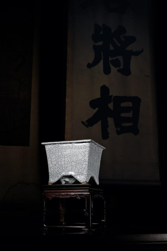 哥窑四方花盆为南宋宫廷遗珍,此类小花盆备受唐宋宫廷青睐,乃贡皇家,以盛“盆景”(宋元时称“些子景”,即小景致之意)之用,初入帝苑、深藏禁中,存世之量或已寥寥。以故宫博物院为例,其共收藏51 件清宫旧藏哥窑,哥窑花盆仅一例,足见其珍罕程度。