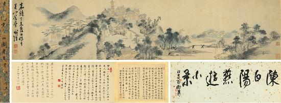 开创 “白阳画派”的陈淳其山水小品《虎丘山图》为难得之佳作,卷后书画大家曾熙有跋:“白阳写花卉,其真迹常易遇,惟山水几如星凤”,可见,陈淳山水在其传世作品中之珍贵程度。作品为钱镜塘旧藏,吴湖帆题签,鉴定大师谢稚柳题引首,清代潘奕隽、罗文彬、曾熙题跋,并在权威著作《中国古代书画图目》中出版。