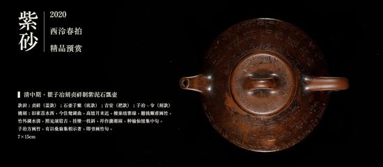 2020西泠春拍紫砂专场呈献清中期·瞿子冶刻吉安制紫泥石瓢壶,瞿子冶携众制壶名手制成此壶,壶身镌刻诗文主体四十字,取自陈曼生《种榆仙馆诗钞》,是瞿子冶以此壶致敬曼生公的佐证。子冶爱竹,取陈曼生的诗文为题钱顺甫画竹诗,钱顺甫是钱载的孙子,从祖法亦善画竹。