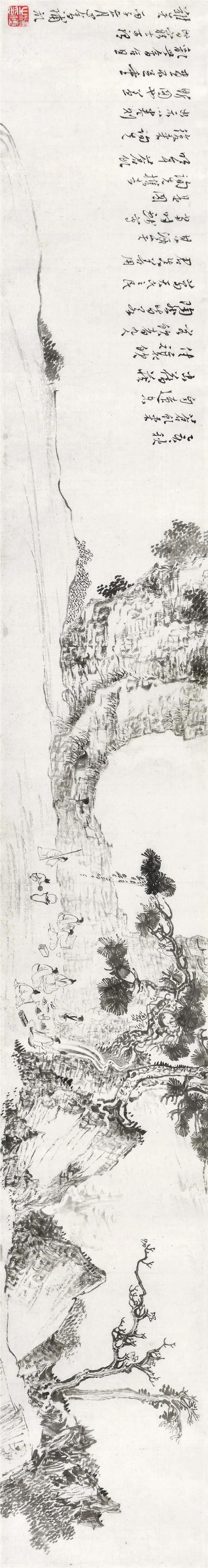 陈少梅、溥心畬分别完成的两段绘画正是以象征手法记录这一盛会,二人远绍古画中的西园雅集图式。文人高士在山林溪间纵情欢饮,人物大小如豆而神采毕现。