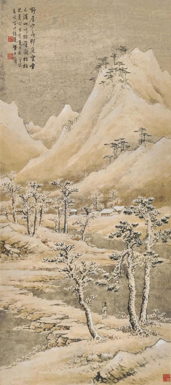 题识: 野屋寒无那,庭空雪已深。山川非旧观,松柏见贞心。丁亥夏日于金陵客次,写此销暑,黄君璧。