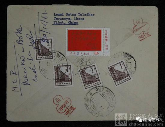 拉萨航空挂号寄尼泊尔封一件、贴纪117、文8各一套、文票、普票七枚(文8红厂铭)、销拉萨戳、海关戳